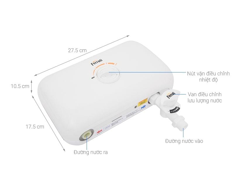 Bình nóng lạnh Ferroli FS 4.5TE 4500W là sản phẩm của Hãng FERROLI-Thương hiệu nổi tiếng của Italia và được sản xuất tại Việt Nam. Thuộc dòng sản phẩm bình nóng lạnh trực tiếp nên không có bình chứa song lại có sẵn thiết kế vòi sen kèm theo. Nhiệt độ tối đa mà bình nước nóng trực tiếp này có thể tạo ra lên đến 55°C,có thể tùy chỉnh nhiệt độ nước theo nhiều mức độ,thêm vào đó là áp lực nước ổn định hoạt động tối thiểu từ 30 kPa - tối đa 300 kPa. Điều thiết yếu nhất đối với sản phẩm bình nóng lạnh là các chế độ an toàn:Cảm biến lưu lượng nước, Cầu dao chống rò điện ELCB, Hệ thống an toàn TBSE, Vỏ chống thấm nước IPX4 cho người dùng sự an tâm tuyệt đối khi sử dụng.
